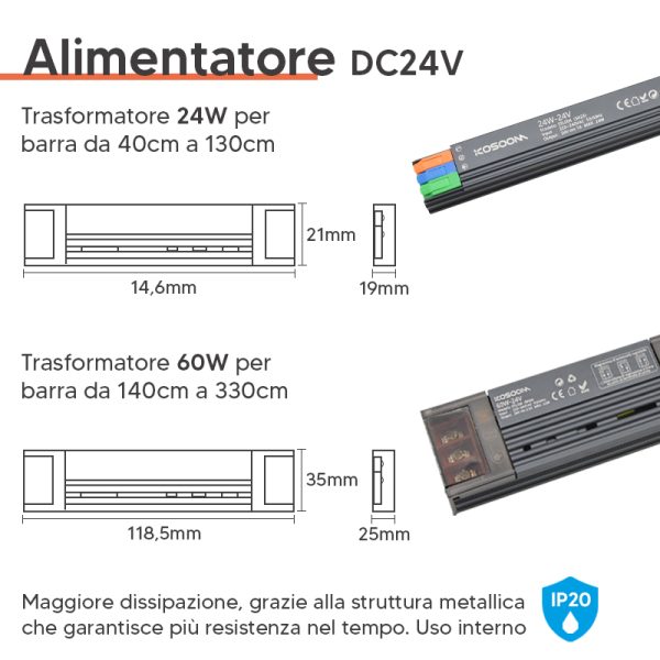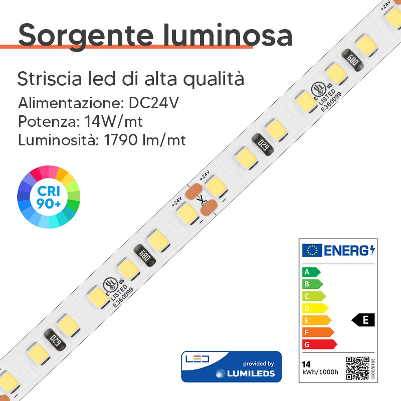Sorgente LED: Strip led DC24V 14W/MT con 1790 lumen al metro