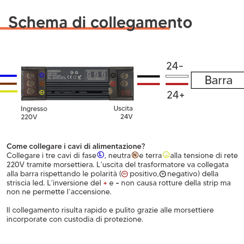 4. Collega la barra led al ricevitore e/o all’alimentatore tramite morsettiera in dotazione.