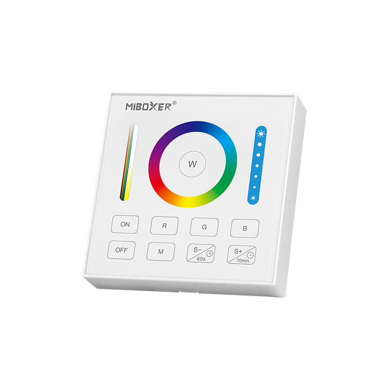 Il pannello remoto MiBoxer RGB+CCT monocanale rappresenta una soluzione di controllo smart e sofisticata per sistemi di illuminazione LED. Grazie al pannello in vetro temperato e al touchscreen capacitivo ad alta precisione, permette un controllo fluido e moderno della luce, con 16 milioni di colori, regolazione di saturazione, temperatura colore e luminosità.