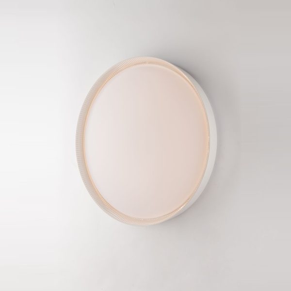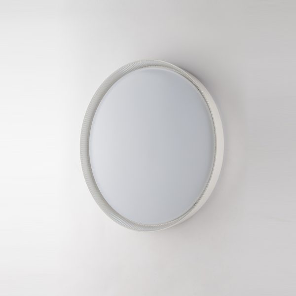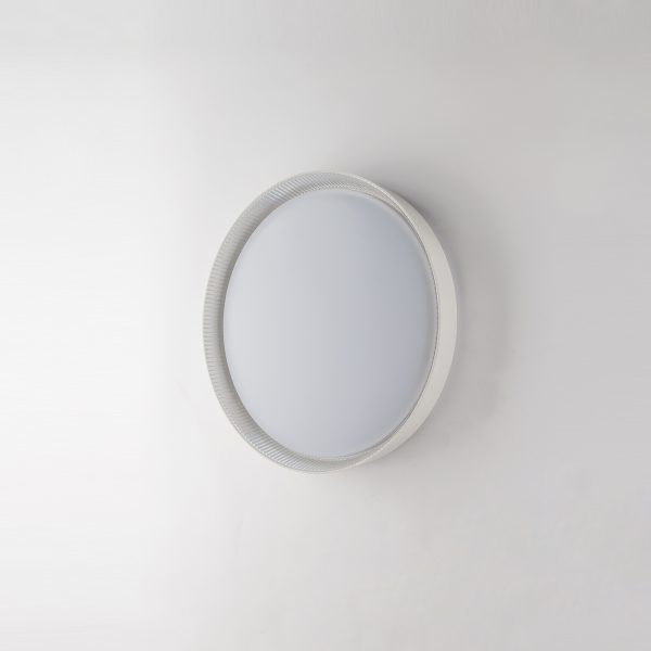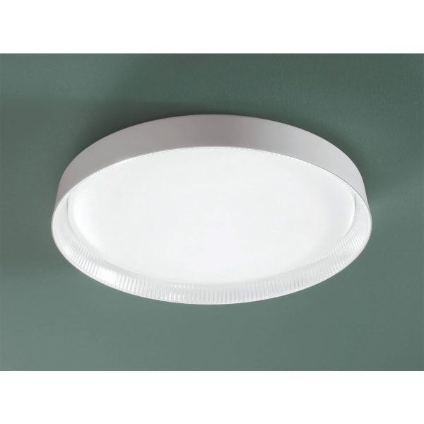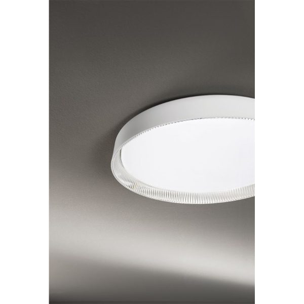 La collezione di plafoniere Kaos è realizzata in fibre plastiche bianca con bordo interno diamantato e diffusore in acrilico bianco satinato.